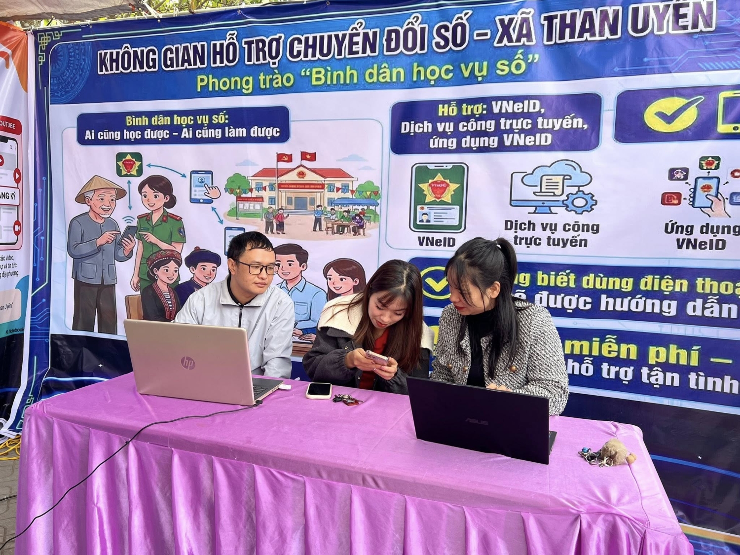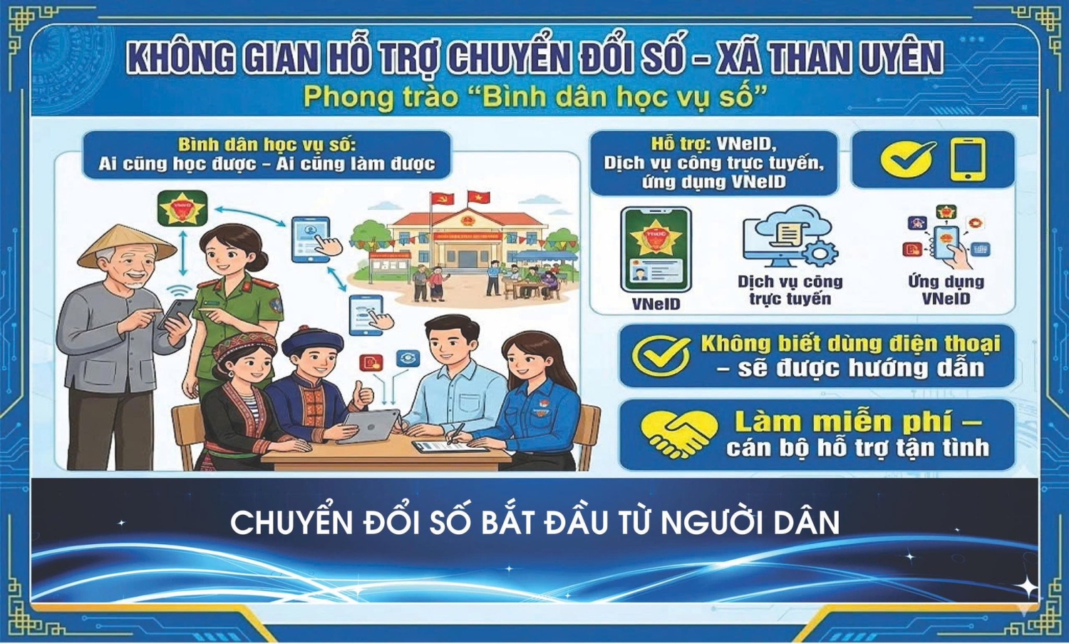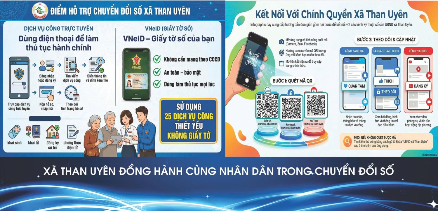 UBND xã Than Uyên trân trọng mời Nhân dân tiếp tục chủ động tìm hiểu, sử dụng ứng dụng VNeID và các dịch vụ công trực tuyến. Khi gặp khó khăn, vướng mắc, người dân có thể đến UBND xã để được cán bộ, chiến sĩ Công an, Tổ công nghệ số cộng đồng và các lực lượng liên quan hỗ trợ miễn phí, tận tình.
